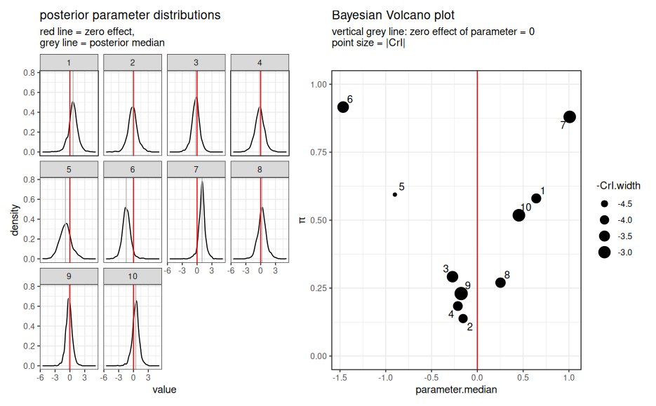 The figure below shows on the left the posterior distribution and on the right the resulting Bayesian volcano plot where