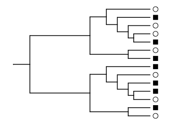 The circle and square communities are all mixed up on the phylogenetic tree. The unweighted UniFrac distance is the fraction of the total branch length where the branch leads to a circle or square, but not both. Here, we would only count the branches leading to the tips of the tree. The length of these branches, added together, is about half the total length for all branches in the tree.
