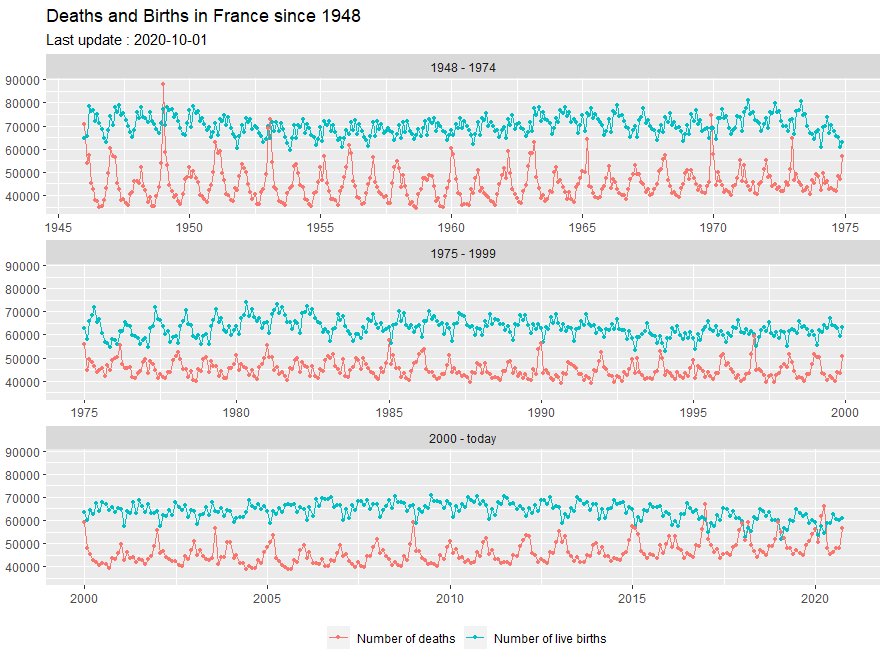 ggtitle("Deaths and Births in France since 1948") +