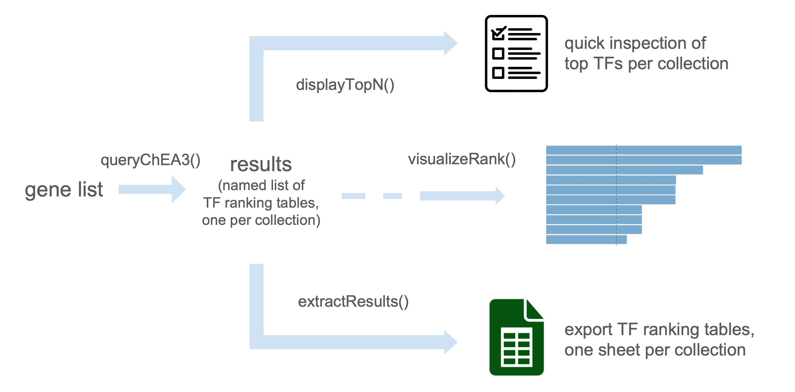 While ChEA3 is only available online as a web server, rChEA3 provides access to this tool directly in R, streamlining transcription factor enrichment into your workflow. Submit gene lists, retrieve TF rankings from multiple evidence sources (ChIP-seq, co-expression, literature), and integrate results into your R/Bioconductor analysis pipeline.